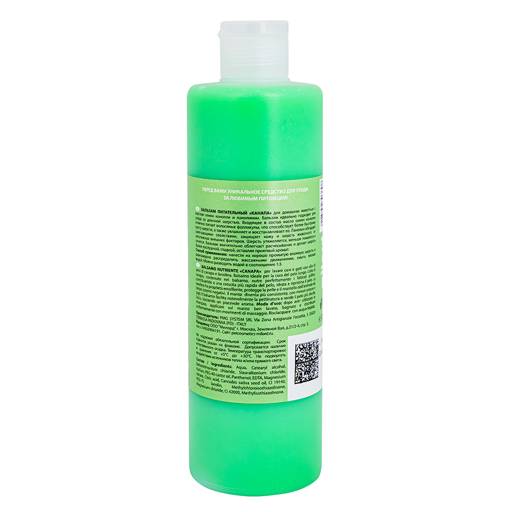 • Масло семян конопли: Уникальный компонент, обеспечивающий глубокое увлажнение, питание и восстановление шерсти.