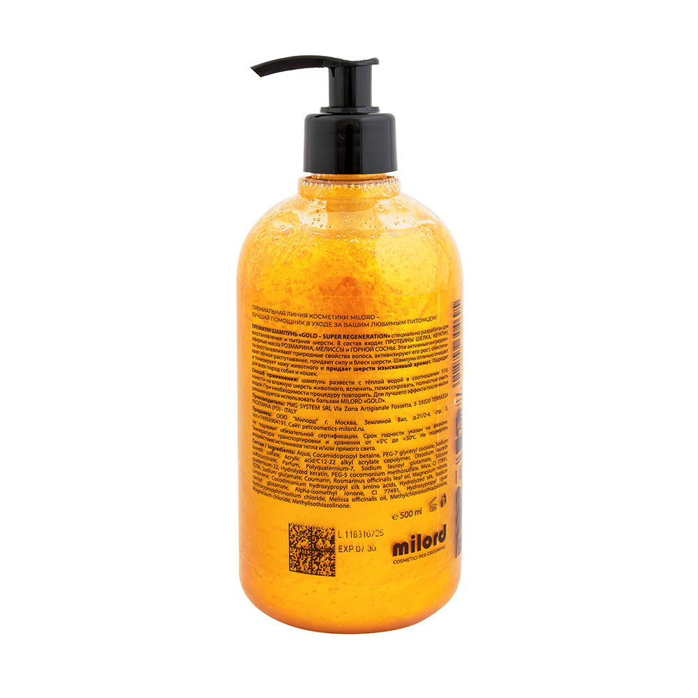 1. MILORD Премиум шампунь GOLD восстанавливающий: Развести 1:10 с теплой водой, нанести на влажную шерсть животного, вспенить, помассировать и тщательно смыть водой. При необходимости повторить.